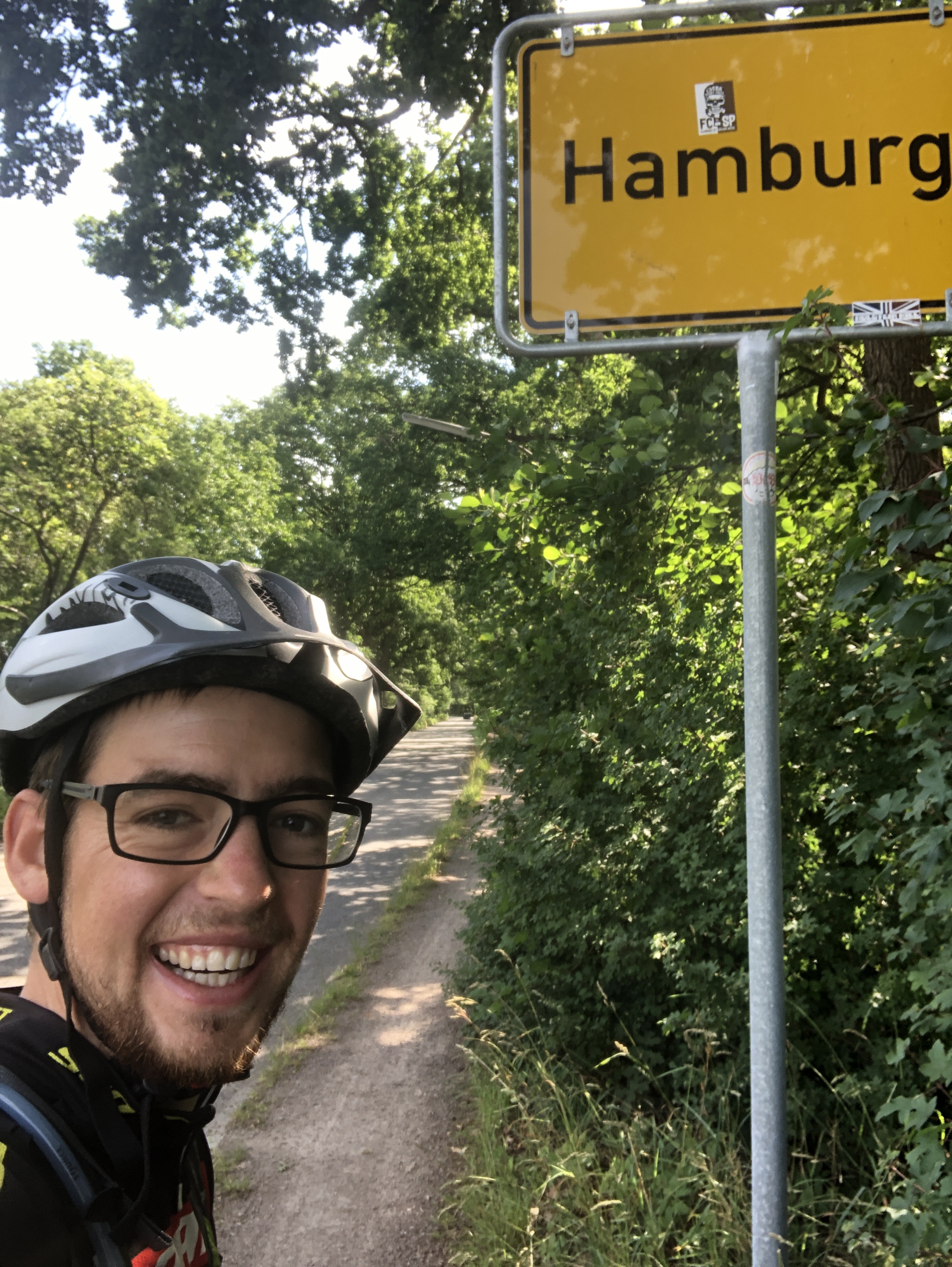 Von Büsum ging es am darauffolgenden Tag zum letzten Stopp vor Hamburg. Es ging nach Glückstadt an der Elbe. Die Stadt wurde 1617 vom dänischen König und Herzog von Schleswig und Holstein gegründet. Der Grund war ein Stadt näher an der Nordsee zu errichten, welche der Hansestadt Hamburg die Stirn bieten kann. Als Christian IV. die Stadt auf Glückstadt taufte, sagte er: „Dat schall glücken und dat mutt glücken und dann schali se ook Glückstadt heeten…“. Damals war diese Gegend eine frisch eingedeichte Sumpflandschaft an der Mündung des Rhins in die Elbe. Die Tour an sich war frühs von Regen begleitet, aber der Weg durch den Kreis Dithmarschen war sehr schön und ich habe es total genossen nach Brunsbüttel zu fahren. Die sehr landwirtschaftliche Gegend mit viel Weideland wirkte auf mich sehr ruhig und ich genoss diese Ruhe noch einmal bewusst, da ich wusste, dass es bald in die Metropole Hamburg gehen wird. Die Stadt Brunsbüttel selber ist nichts besonderes, aber dort angekommen war ein Vater mit seinen beiden Kindern unterwegs und die Tochter war so neugierig und fragte mich allmöglichen Dinge. Das coolste war: „Wenn du so viel unterwegs bist, warum dann nicht mit dem Auto?“ 😀 Ich antwortete: „Das wäre doch viel zu langweiligt.“ Und Sie. „Stimmt!“ 😀 In Glückstadt schaute ich dann mit einigen HSV Fans den letzten Spieltag der 2. Liga. Ich trauerte nach der bitteren Niederlage mit Ihnen… Bei Heiko, meinem Couchsurfer war es spitze. Er selber war viel mit dem Fahrrad unterwegs. Unter anderem fast die komplette Ostsee, auch der russische Abschnitt war dabei. Das hat mich sehr begeistert! Sein Abenteuer dieses Jahr an der Wolga entlang fällt nun leider aus wegen Corona. Mit einem Foto von einem Freund aus der Bretagne gab er aber eine Wette ab und will etwas spenden, wenn ich dieses Foto dem Freund vorbei bringe. Die Idee fand ich spitze und habe die Wette natürlich angenommen! Der Weg nach Hamburg am Tag darauf ging viel hinter dem Deich entlang und war sehr schön! Als ich das Ortsschild von Hamburg neben mir hatte war ich natürlich wieder sehr stolz!!! Entlang an den Landungsbrücken ging es über den Jungfernstieg ab nach St. Pauli. Ich löste die Wetteinsätze der Alten Herren (Fussball) ein und machte ein Selfie mit den Stadien von St. Pauli und dem HSV. Den Abend genoss ich mit Freunden im Schanzenviertel. Der Pausentag in Hamburg habe ich genutzt um mich über die Niederlande zu informieren, neue Kopfhörer zu kaufen und meine Sonnenbrille reparieren zu lassen, da die leider etwas verbogen wurde. An diesem Tag machte ich auch mit Jochen (war auf Sizilien dabei) aus, dass wir uns in Amsterdam treffen. Somit stand es fest: Ich fahre nach Amsterdam! Während der Tage war mein Fahrrad im Hotelzimmer am Kleiderschrank angeschlossen, da der Hausmeister es mir erlaubte, weil in letzter Zeit viele gestohlen wurden. Ein sehr lustiges Bild 😀