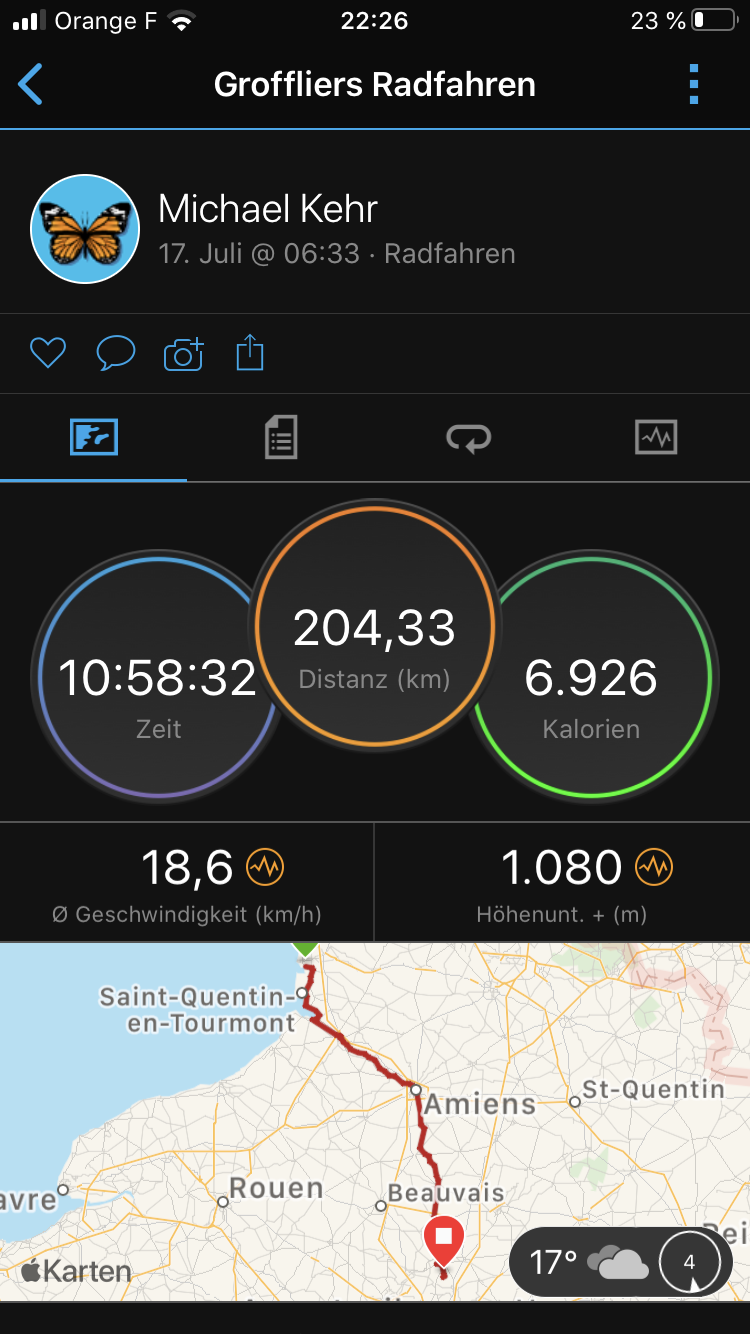 So, an diesem Tag soll es also vor die Tore von Paris gehen, zu den Eltern von Deborah, bei der ich in Paris übernachten kann. Dreiviertel der Route war einfach total schön. Das Naturreservat an der Mündung zur Somme und dann entlang der Somme nach Abbeville und Amiens. Beides sehr schöne Städte und dann waren auf dem Weg noch kleinere Ortschaften. Einfach toll! Vor allem der Teil von Abbeville nach Amiens war schön, da der Fluss hier natürlich verläuft und nicht begradigt ist. Nach Amiens ging es dann wieder auf und ab. Durch die Hügellandschaft, welche landwirtschaftlich mit Feldern geprägt ist. Alte kleine Dörfer lagen auf dem Weg und machten somit diesen Abschnitt, trotz der Anstrengungen, zu einem tollen Teil des Tages. Sobald ich in der Nähe von Paris war wurde es grausam, weil Komoot mich auf Schnellstraßen schickte und ich da nicht fahren durfte. So plante ich mit Hilfe meines Smartphones immer wieder meinen Weg. Der letzte Abschnitt führte dann noch durch Sandwege, welche für Pferde sind. Schieben war angesagt. Ich war platt, einfach platt… Doch ich habe gelernt mich zu motivieren und somit schaffte ich es auch an diesem Tag mein Ziel zu erreichen! Nach 204 km war ich am Ziel! Verrückt!!! Mein Fahrradsattel passte ich an, da er locker war und schaute nach den Bremsen, da sie Schleifgeräusche machten. Wir aßen aber dann und somit wollte ich in Paris nochmal schauen. In der Gartenlaube schlief ich relativ schnell ein und war froh als es am nächsten Tag mit dem Zug nach Paris ging, weil es durch die Schnellstraßen ein Graus geworden wäre… Nach 18 Minuten war ich am Gare de Noord und fuhr von dort mit dem Fahrrad zur Seine und zu Deborah. Ein krasses Gefühl war es natürlich durch die Straßen zu fahren und dann den Eiffelturm zu sehen!!! Unfassbar! 🙂