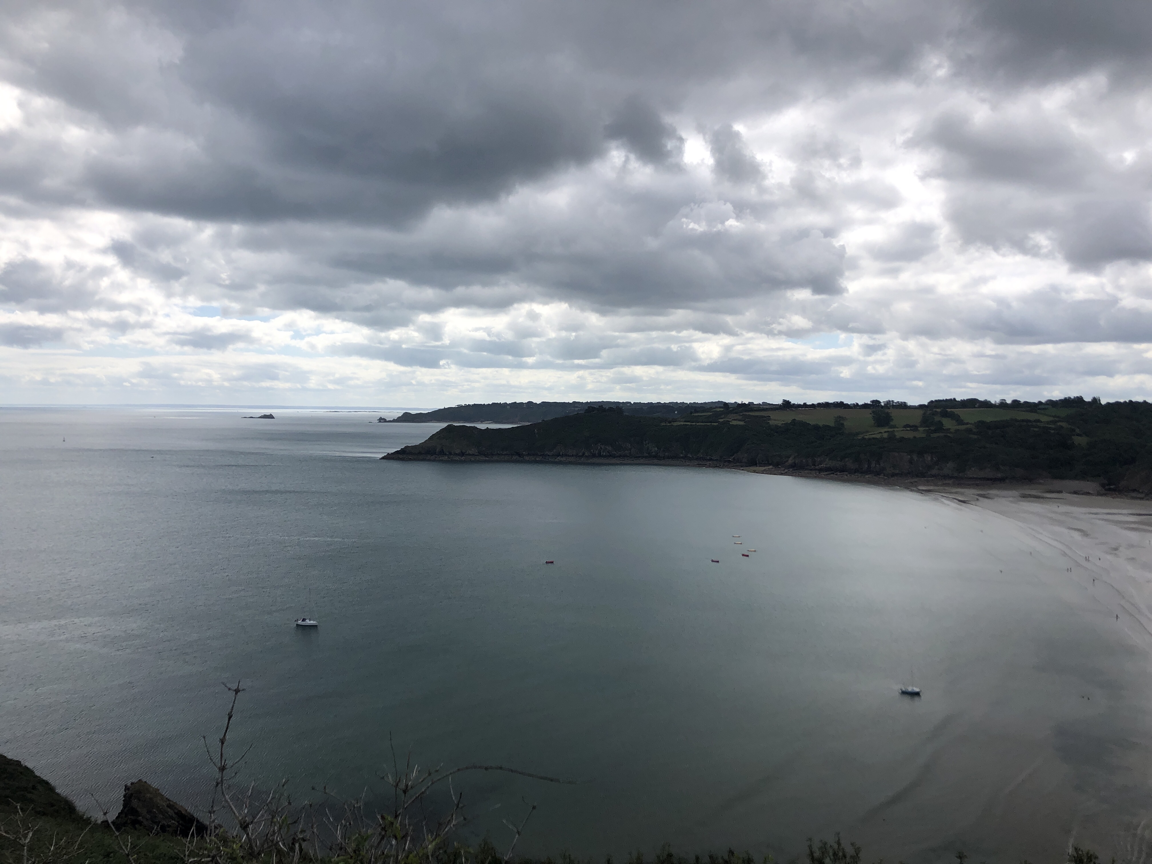 Die 2 Tage nach Morlaix waren anstrengend! Die Bretagne mit seinen Hügeln lassen einen noch mehr schwitzen als in der Normandie. Ich lernte auch das sich schnell ändernde Wetter kennen. Frühs hatte ich Sonne dann gegen Mittag wurde es bewölkt und windiger mit kurzen Schauern und abends wieder sonnig warm! Trotz des sportlichen Ziels lies ich mir an den sehenswerten Orten die entsprechende Zeit! Ich startete erst gegen 8:30 Uhr in St. Malo, weil ich die Markthalle besuchen wollte. Dort deckte ich mich mit Obst, Baguette und verschiedenen Keksen ein. Der Bäcker fragte mich aus, woher ich komme und was ich mache! Er war begeistert und wünschte mir viel Glück oder besser „Bon Voyage“. Der Fischmarkt war natürlich sehr besonders! 🙂 Über die große Brücke ging es dann nach Dinard, diese Stadt liegt gegenüber von St. Malo und ist selber sehr schön mit seinen Hafen und kleineren Villen! Der Blick auf St. Malo war hier immer wieder für ein Stopp gut! Nach Dinard ging es immer wieder durch kleinere Orte an der Küste. Auch war immer wieder mal die Möglichkeit sich eine Pause an einem der vielen Aussichtspunkte zu gönnen. Der besonderste Platz und der eindrucksvollste an diesem Tag war das Cap Fréhel. Hier war der perfekte Zeitpunkt um eine längere Pause einzulegen. Dieses Cap zeigt das wilde der Bretagne und man fühlt sich wie in Schottland oder noch weiter nördlich. Um 18 Uhr war ich ca. 40km Saint-Brieuc und an einem weiteren schönen Aussichtspunkt. Dort war ein Parkplatz und dahinter standen ein Van und es war unter den Bäumen ein Platz für mein Zelt. Ich überlegte nicht zweimal und bevor ich mir bei der dicht besiedelten Rund um Saint-Brieuc etwas suche, fragte ich kurz die zwei mit dem Van. Es stellte sich heraus, dass das Pärchen Schweizer waren und somit konnten wir uns auf Deutsch unterhalten, was mich natürlich sehr freute! Nach dem Zeltaufbau ging es unten an der Küste zwischen den Felsen in einer kleinen Bucht schwimmen. Nach dem Essen konnte ich mir von einem kleinen Hügel auf den Klippen, wo auch der Wanderweg entlang führt, den Sonnenuntergang anschauen. Bis kurz vor 23 Uhr quatschten ich mit den Schweizer und wir hatten einen tollen Abend!