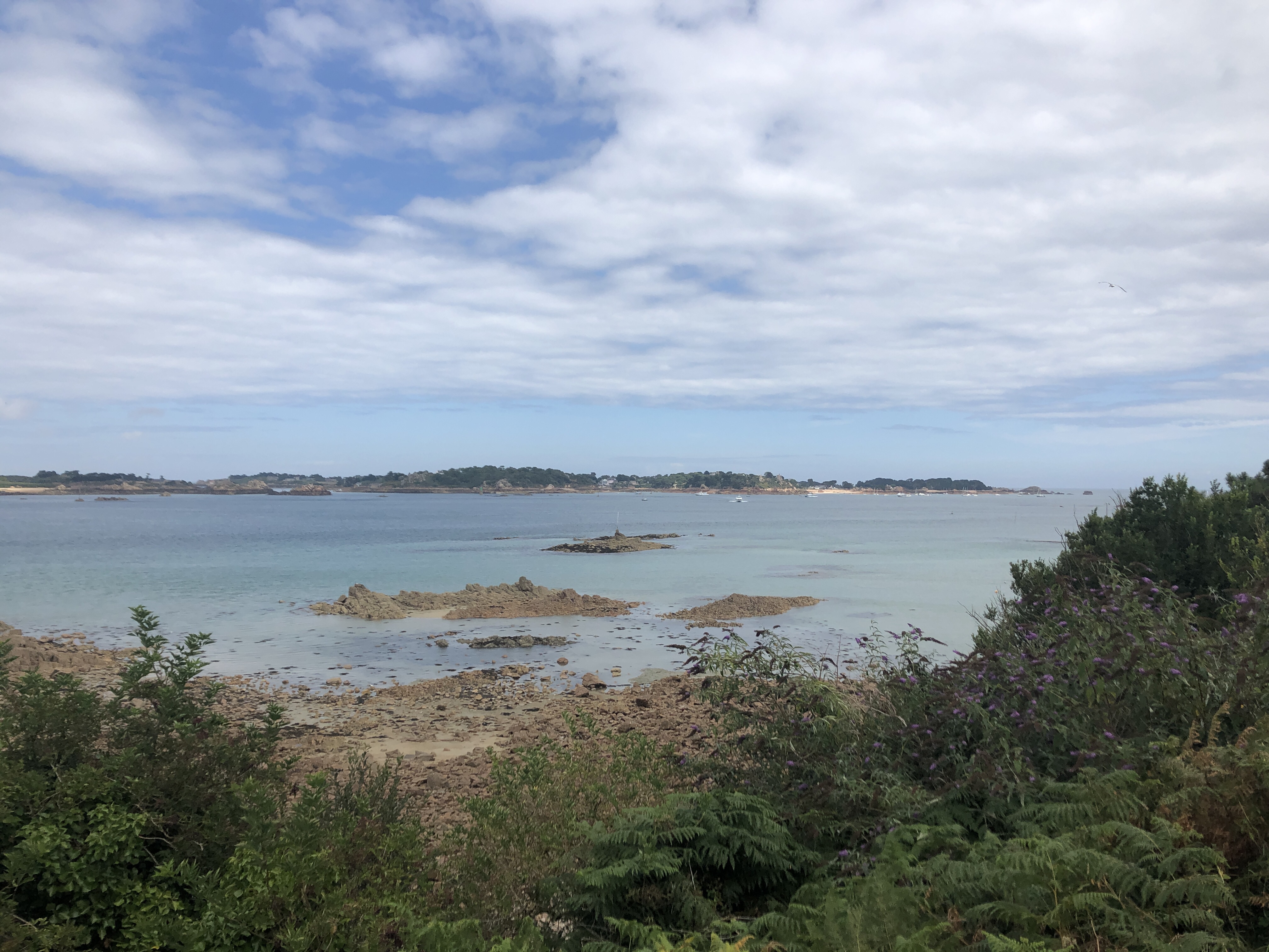 Der nächste Tag wurde wie angekündigt sehr anstrengend, denn ich wollte ja Ramon in Morlaix erreichen. So ging es wie sonst auch immer, schon gegen 7 Uhr los! Schon im nächsten Ort ging mir der Geruch von frisch Gebackenem in die Nase und somit hielt ich dieses Mal schon relativ bald an und kaufte mir meine Backwaren und setzte mich in die Bar gegenüber um dort mein Crossaint mit dem Kaffee zu genießen. Es war ein guter Start in den Tag! Bei Yffiniac ging es durch das Gebiet der Urne die hier in die „Baie Saint-Brieuc“ mündet. Ab diesem Tag genoss ich jeden Morgen mit dem besonderen Licht am Atlantik, auch hier war es etwas besonderes, da der Wasserstand durch die Tide sehr gering war und somit die Sonne sich in den kleinen Pfützen in der Bucht spiegelte. Die Wege durch die kleineren Waldstücke filterten die Sonne auf eine besondere Art und Weise! Wenn ich auf meine Touren schaue bin ich die ersten Stunden immer langsamer als normalerweise, ja es liegt auch an der Müdigkeit, aber ich glaube vor allem, weil ich jeden neuen Start sehr genieße! Ein Tag kommt einem so endlos vor auf dem Rad, wie auch beim wandern. Die Stadt Saint-Brieuc war im Morgen mit großem Verkehrsaufkommen kein längeren Aufenthalt wert und so ging es weiter zu dem Highlight des Tages! Es waren die Aussichtspunkte der Bucht von Saint-Brieuc. Von Brehec bis nach Paimpol war es zwar ziemlich anstrengend und ich sammelte an steilen Straßen einige Höhenmeter, aber die Ausblicke lohnten sich. Die Bucht von Brehec und das kleine Städtchen Paimpol, wo ich mir ein so leckeres Kaffeeeis schmecken lies, hat mit seinen engen Gassen, seinem schönen Hafen schon etwas zu bieten! Von Paimpol ging es nun an das Ende der Bucht zum Archipel L‘Arquest. Eine Ansammlung von Felsen lagen hier sichtbar durch die Tide im Meer und die Felsen der Insel „Ile-de-Bréhat“ konnte man so gut erkennen. Hier muss man das Gewässer kennen, sonst ist das Boot schnell kaputt, dachte ich mir. Ich lies mich nicht stressen, weil Ramon ja dem Campingplatzinhaber Bescheid gegeben hatte. Von diesem Archipel ging es nun nicht an der Küste entlang bis nach Lannion. Es ging über kleinere Dörfer in der hügeligen Landschaft hinter der Küste. Ich war froh in Paimpol mein Wasservorrat aufgefüllt zu haben, weil bis Lannion hätte es da keine Möglichkeit gegeben. Von Lannion ging es dann weiter ans Meer zurück nach Saint-Michel-en-Grève. Hier war die letzte Pause bevor es nach Morlaix ging. Die Fahrt nach Morlaix war entlang der Hauptstraße und somit nichts besonderes. In Morlaix kaufte ich mir und Ramon jeweils ein Bier und wir bestellten Pizza und ich noch Jalapeños. Mein erstes Fastfood auf der Tour! Wir beide genossen den Abend an unseren Zelten. Das lustige war, dass er von mir den anderen erzählte und die mich schon alle erwartet haben. Sie waren alle total begeistert! Am Ende standen bei 165 km über 1.600 Höhenmeter auf dem Tacho… Zum Glück ging es am nächsten Tag nur nach Roscoff (ca. 40km).