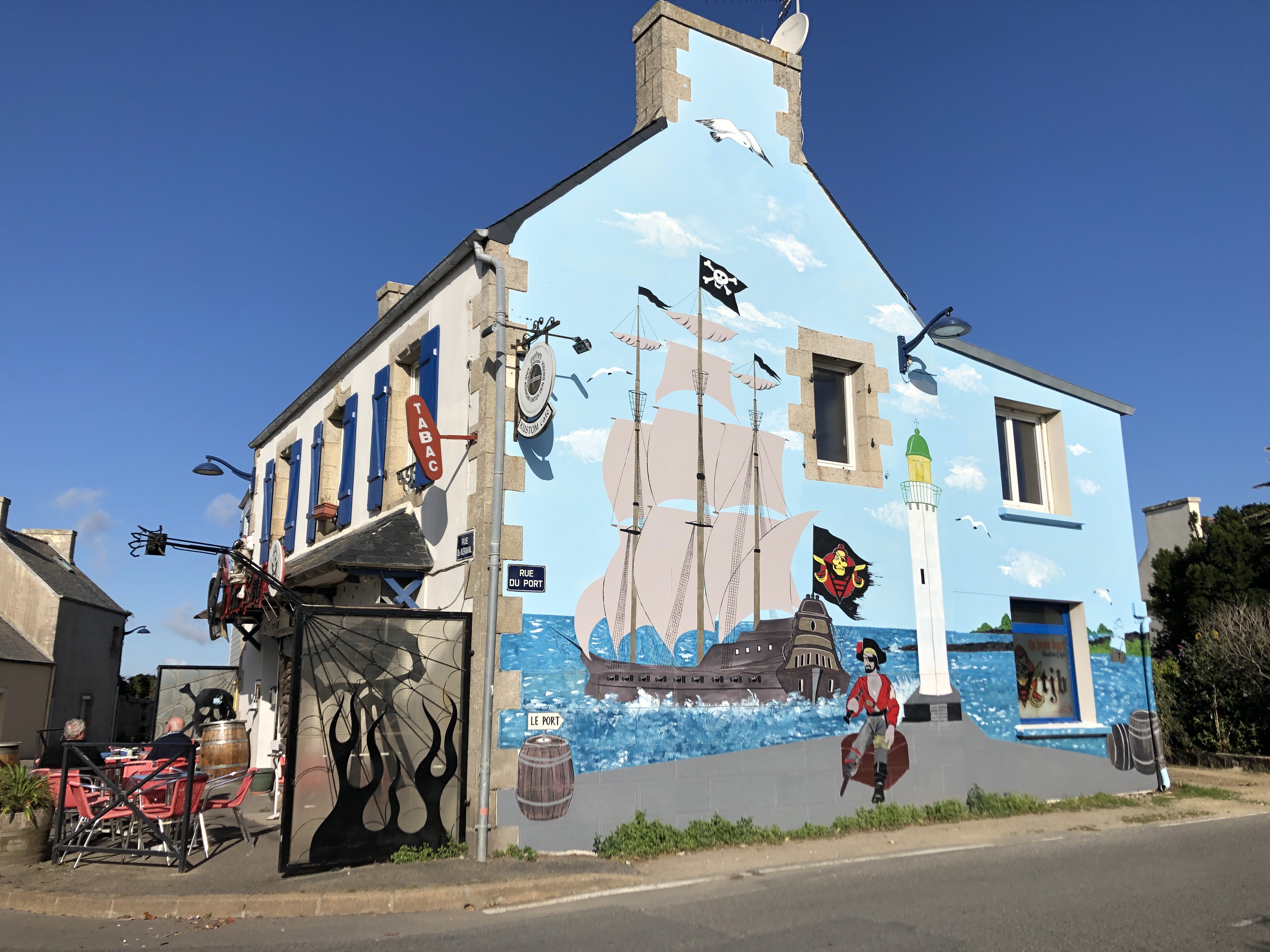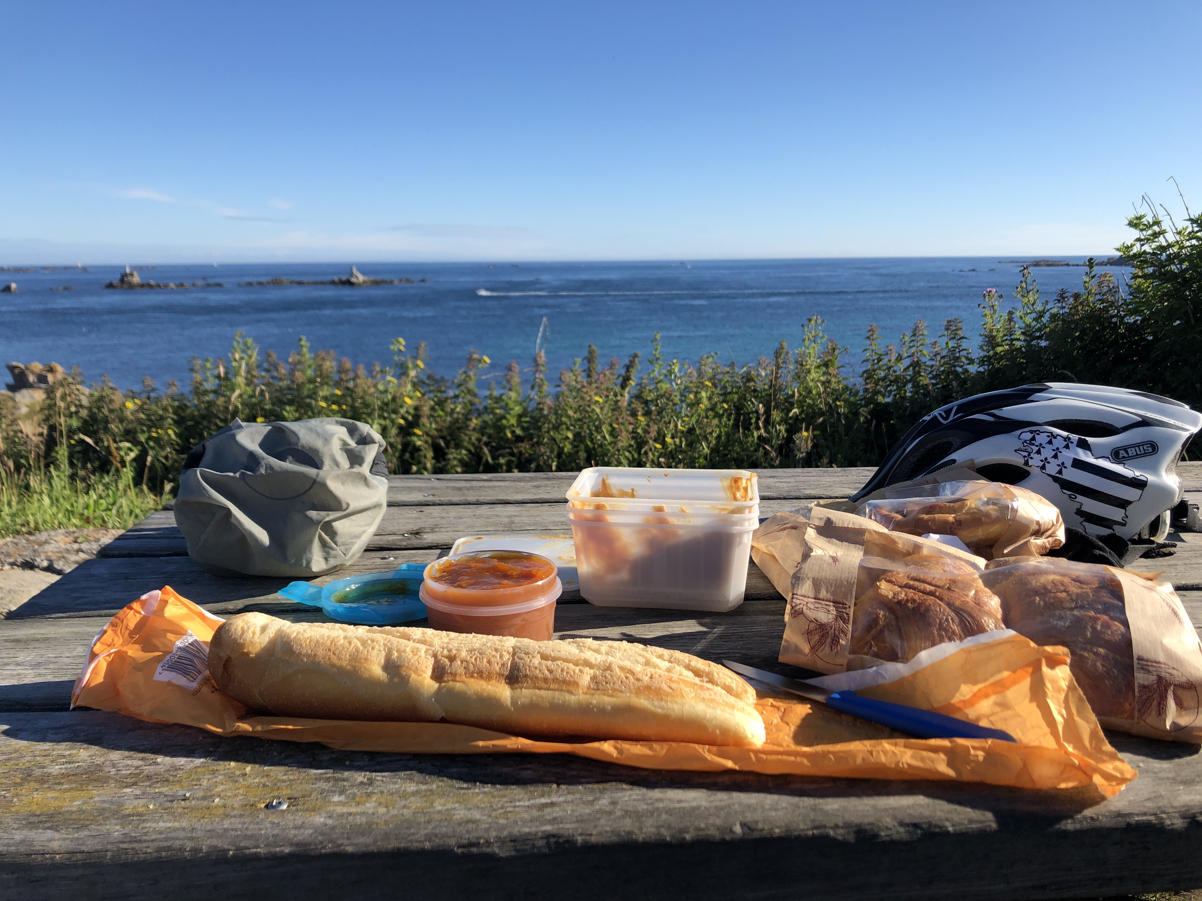 Der nächste Morgen startete entspannt. Trotz der großen Pizza bekam ich um 7 Uhr Hunger und machte mir Haferflocken und einen Kaffee. 😀 Um 10 fuhren wir zusammen zu einer Bäckerei und mit einem Kaffee und frischen Crossiant und Pain au Chocolat in Morlaix ließen wir uns an einer Kirche nieder und starteten in den Tag. Ramon erwischte keinen guten Tag und hatte starken Regen, ich dagegen fuhr zur Küste und hatte nur einen kurzen Regenschauer. Die kleineren Städtchen Carantec und Saint-Pol-de-Léon haben mit Ihrem alten Stadtkern einen besonderen Flair! In Roscoff muss man den Blick von der Kapelle auf den Leuchtturm und den Hafen genießen! Es ist ein wunderschöner Anblick, wenn die Sonne die Häuser am Hafen anstrahlt. Zur Feier des Tages gönnte ich mir eine Portion Pommes! Später genoss ich die Zeit am Zelt und am Strand. Ging schwimmen, las und schrieb ein wenig. Es war ein toller Tag und nun war ich in Roscoff. Leider ging die Fähre nicht nach Irland bzw. Sie fuhr schon, aber man darf kein Fahrrad mitnehmen. Aber ich wusste, dass mein Weg nun weiter an der Küste in der Bretagne weitergeht. Ich freute mich so sehr darauf zu starten, dass ich früh ins Bett ging um am nächsten Tag fit zu sein! 🙂