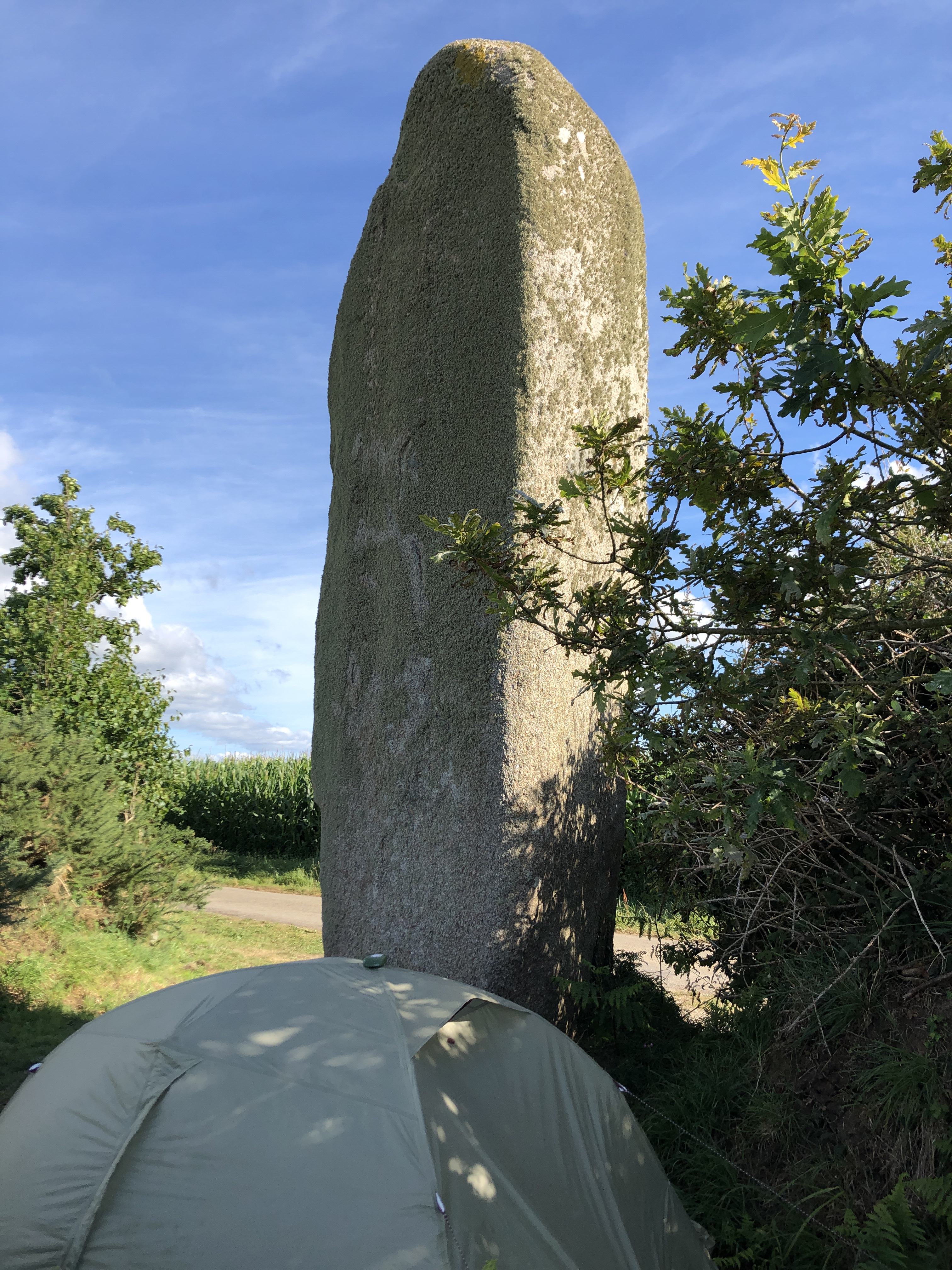 Nun ging es 4 Tage durch den schönsten Teil der Bretagne! Natürlich muss jedem bewusst sein, dass dies mit dem Fahrrad kein einfaches Unterfangen ist, denn es geht auf und ab, aber jeder kleine Berg bietet eine wunderbare Aussicht! Los ging es also von Roscoff mit einem wunderschönen Sonnenaufgang! Es ging ein wenig weg von der Küste, weil ich jeweils über die Flussmündungen des „L‘Horn“ und des „Guillec“ musste. Um diese zu überqueren musste ich immer ein wenig ins Landesinnere, weg von der Küste. Das sollte sich die nächsten Tage noch öfters so sein. Wichtig ist zu bemerken, dass die Straßen oft nicht im Tal verlaufen sondern seitlich des Flusses auf Hügeln, somit war es für den Kopf nicht immer leicht sich zu motivieren. In Plounéour-Trez fand ich einer der kleinen Supermärkte in den Ortschaften. Ich finde das echt super in Frankreich und gerade in der Bretagne wird hier vieles aus der Region verkauft. Ich füllte mein Vorrat auf und kaufte mir einen tollen Sticker der Bretagne für meine Helm! Mal ein kleines Souvenir! Ich gönnte mir dann noch ein Crêpes mit Zucker und Butter, die gerade mal 1,50€ oder 2€ kosten. Ich merkte immer mehr wie ich mich in die kleinen Ortschaften mit Ihren weißen Häusern und oft blauen Fensterläden verliebt habe. Es ist etwas besonderes, wie die Steinhäuser in der Normandie. Diese findet man hier zwar auch, aber eher im Landesinneren. Die Namen der Ortschaften und von Cafés sind oft auf Bretonisch. Bei den Ortsschildern steht immer der bretonische Name darunter! Einzigartig in der Bretagne sind die Namen mit einem „y“. Das ist sonst in normalen französischen Wörtern nicht zu finden. Vielen merkt man an, dass Sie sehr stolz auf Ihre Region sind und zeigen das mit Ihrer Kleidung, Aufklebern auf dem Auto oder im Supermarkt. Ein Highlight an diesem Tag war neben der tollen Küstenlandschaft mit Ihren Felsen im Meer, das kleine Dorf „Meneham“. Dieses liegt direkt an der Küste und ist heute ein Museumsdorf mit einer Herberge und einem Restaurant. Das Dorf stammt aus dem 17. Jahrhundert und liegt von kleineren Hügeln umgeben, hinter einem großen Fels, der den Westwind vom Meer vom Dorf abhält. Die „L‘Aber Wrac‘h“ und „L‘Aber Benoît“ formen zwischen den kleineren Städten „Lilia“ und „Saint Pabu“ die Landschaft. Dieser Abschnitt ist auch als „Côte des Abers“ bekannt. Diese tief, in das Landesinnere eindringende Meeresbuchten nennt man „Ria“. Der Unterschied zu einem Fjord in Norwegen ist, dass die Ria‘s nicht von Gletschern, sondern von Flusstälern geformt wurden. Die teilweise sehr steilen Abhänge kann man immer wieder von der Straße aus bewundern! Auf der Höhe des „L‘Aber Benoît“, fand ich einen perfekten Platz für mein Zelt. Ich schlug es auf an einem Menhir oder für mich einfach ein Hinkelstein! 🙂 Ich hatte zwar zweimal von Touristen Besuch bekommen, aber ansonsten konnte ich ganz in Ruhe schlafen und den Blick auf Saint Pabu am Abend genießen! Eine außergewöhnlicher Platz!