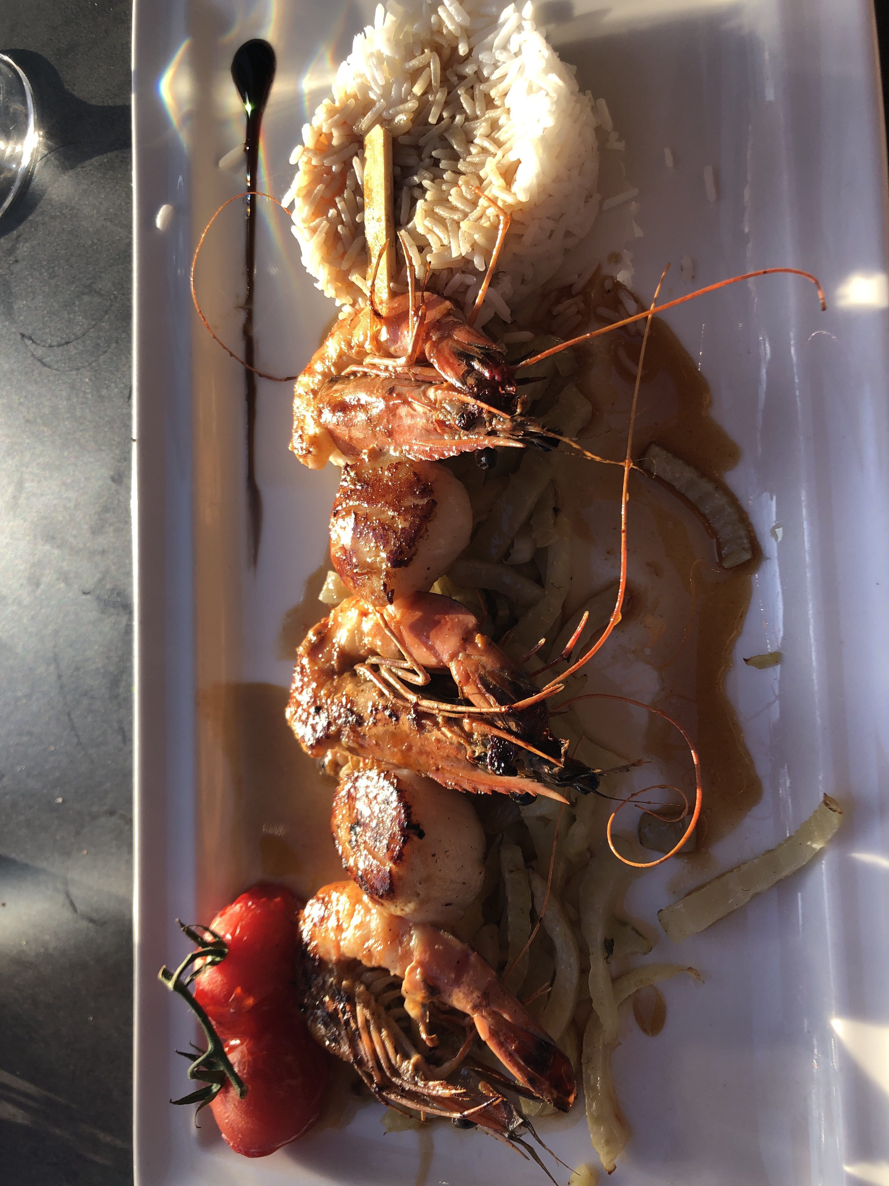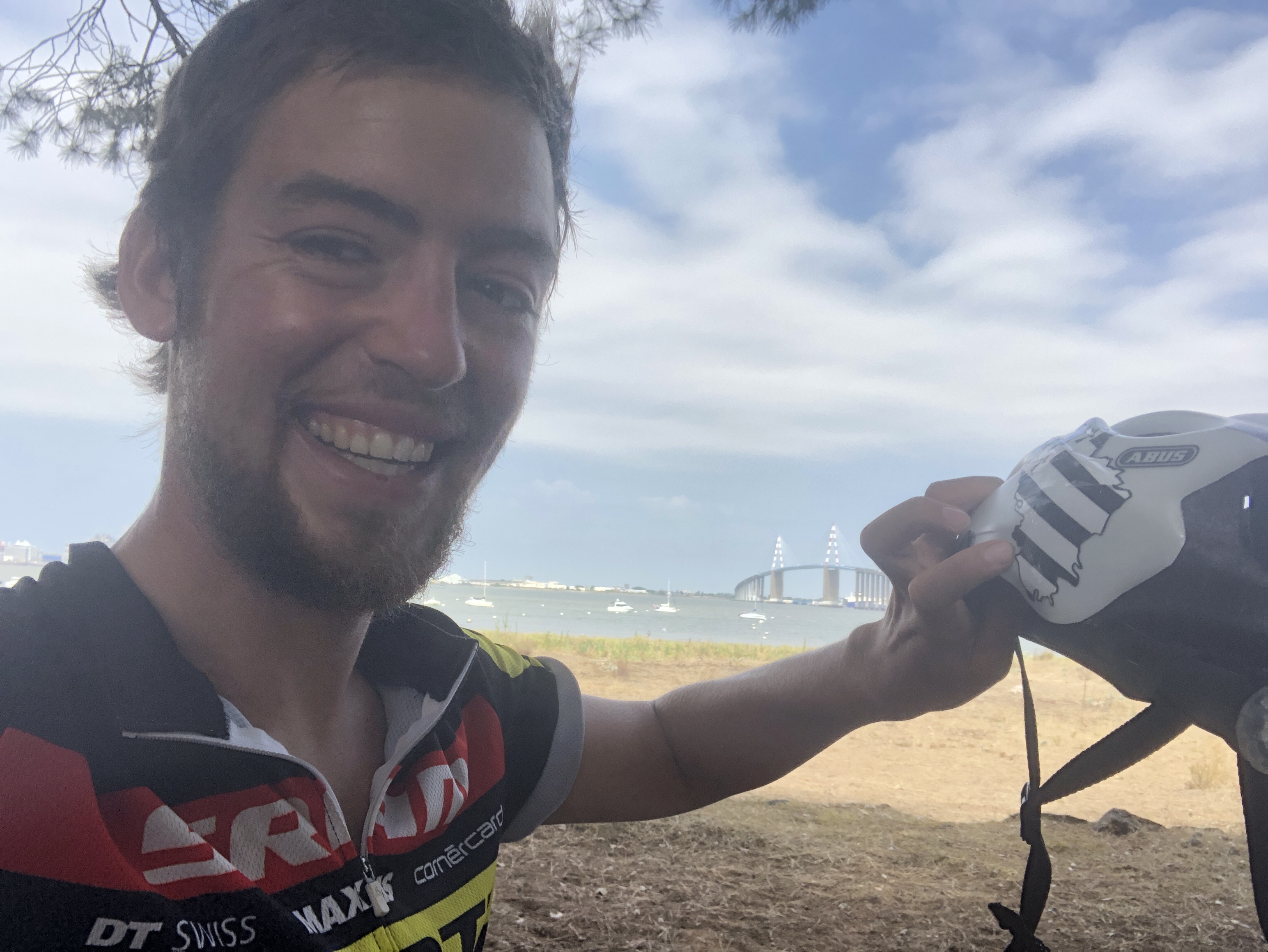 Der nächste Tag ging von meinem Campingplatz in Lesconil nach Pont l’Abbe, ein kleiner Hafenort mit dem Blick auf die Île-Tudy. Dort am Hafen hatte ich mit einem Croissant und einem Pain au Chocolat den besten Blick auf die Insel! So schmeckt ein Kaffee und ein « Petit Déjeuner « , wie die Franzosen Ihr Frühstück nennen, besonders gut! 🙂 Der Radweg auf der Île-Tudy war sehr schön! Zuerst ging es durch kleine Wälder und an Weiden und Seen vorbei, bis es entlang der Dünen am Strand nach Sainte-Marine ging! Traumhaft war der Sonnenaufgang an diesem Tag. Ich liebe es, wenn das Meer noch ruhig ist und die Schiffe darauf leicht hin und her wiegen. Wenn dann das erste Licht auf dieses Schauspiel fällt muss ich anhalten und es genießen! Von Sainte-Marine ging es dann über eine große Brücke, wo man einen herrlichen Blick auf den „L‘Odet“ hat, der Bei Sainte-Marine und gegenüber Bénodet ins Meer mündet. Angekommen ging ich an die Fähranlegestelle am Hafen um nach einer Fahrkarte für die Insel „Saint-Nicholas“, wo ich mein Pausentag verbringen wollte, zu fragen. Leider war von Concarneau, dem eigentlichen Ziel heute, keine mehr frei und somit entschied ich kurzerhand in Bénodet mein Zelt aufzuschlagen und von dort aus morgen auf die Insel zu fahren. Vorher musste ich aber noch eine Wette einlösen von „Lui“. Er empfahl mir eine „Boulangerie“ (Bäckerei), die er beim letzten Urlaub als die beste emfpand. Ich sollte ein Baguette kaufen und ein Selfie mit der Verkäuferin machen. Gesagt getan bat ich um ein Selfie. Zum Glück konnte die Tochter Englisch und ich erklärte ihr meine Reise! Tolle Sache die Wette! 🙂 Den Tag chillte ich am Zelt, ging einkaufen und hatte einfach frei. Mein Körper fuhr sofort runter und am Strand schlief ich ein, bis ich von einem typischen kurzen Schauer unsanft geweckt wurde 😀 Der Pausentag war von Anfang geplant und somit war an diesem Tag auch ein tolles Abendessen drin. Es gab Gambas und eine Creme Brûlée. Man gönnt sich ja sonst nichts! Der Tag auf der Insel verlief ganz einfach. Ich lag am Strand, hörte Musik und schlief. Ab und zu ging es natürlich ins Meer! Der Sand dort ist weiß und das Wasser ist kühler als an der Küste! 🙂 Wunderbar!