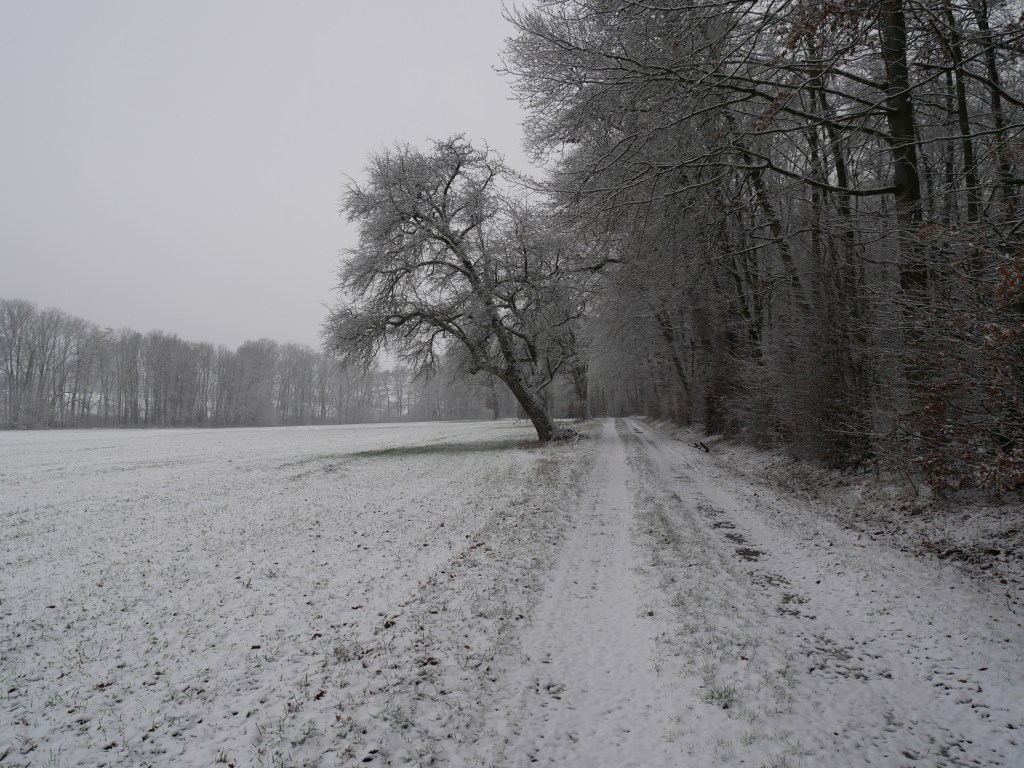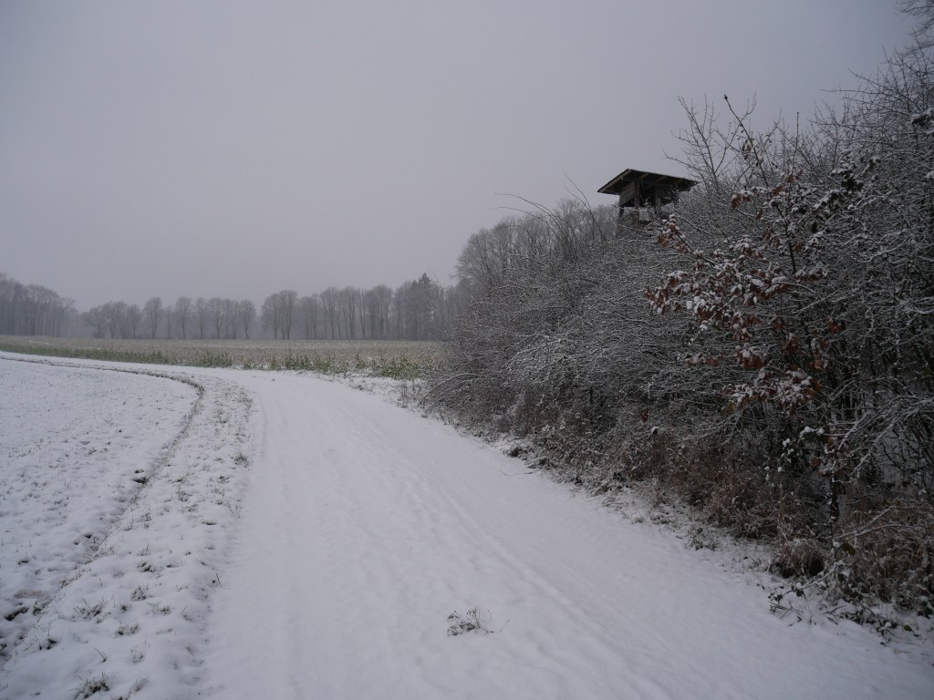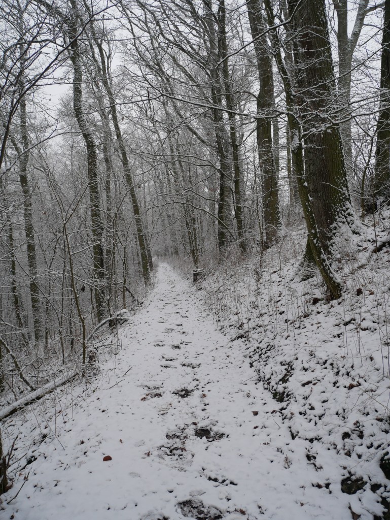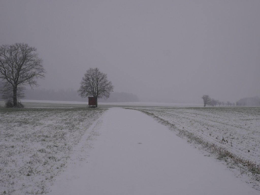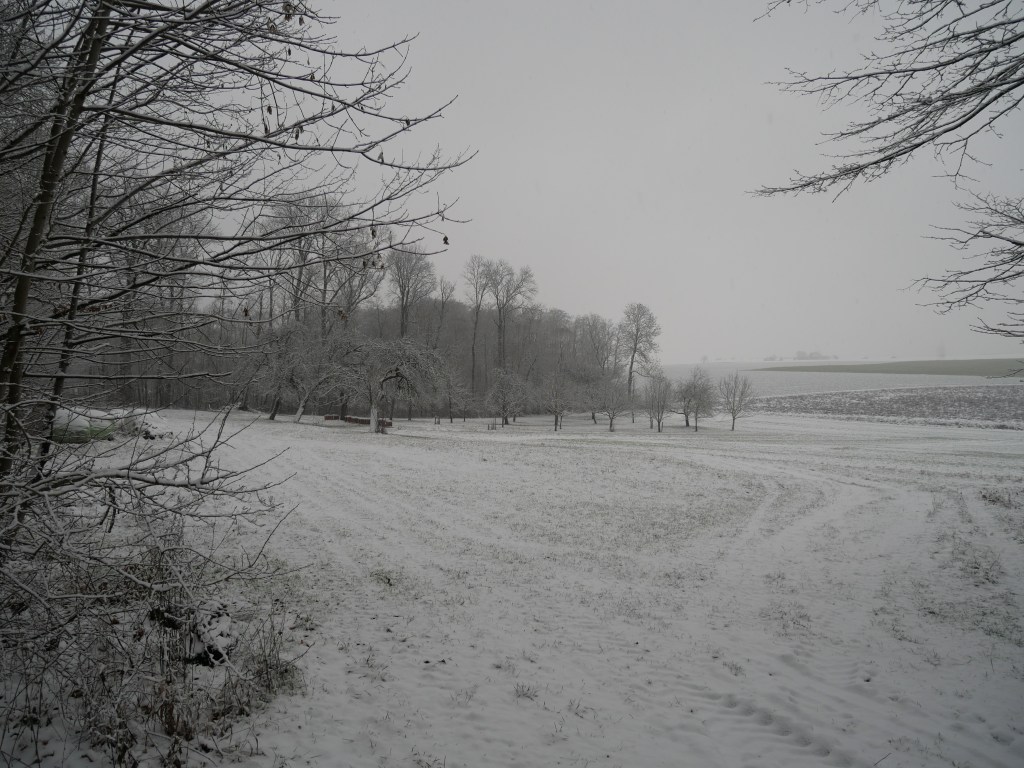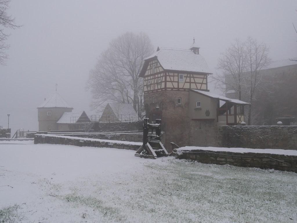 Als ich am Samstag auf den Wetterbericht schaute war klar, dass ich mich am Sonntag in der Früh zu einer Wanderung aufmache. Ich plante kurzerhand meine Tour und ging früh ins Bett. Um 6 Uhr klingelte der Wecker, was sich für einen Sonntagvormittag natürlich erst einmal doof anhört. Erstaunlicherweise kam ich sehr gut aus dem Bett und nach den zwei Tassen Kaffee und einem kleinen Frühstück, ging es um kurz nach 7 Uhr los. Als ich die Tür meine Wohnung verlassen hatte, war es noch dunkel und die Laternen beleuchteten die Straße. Es schneite und alles war bedeckt von einem dünnen weißen Teppich. Ich machte meine Stirnlampe an und lief los. Es ging auf in Richtung Jagsttal durch den Brüchlinger Wald. Auf dem Frankenweg „HW8“, welcher durch den Wald bis nach Langenburg ging, lief ich durch den verschneiten Wald. Die Ruhe in den Morgenstunden war wunderschön! Schon bald sah ich die ersten Rehe und Füchse über die Waldwege huschen. In meinen Gedanken war ich beim 18. September, als ich von Unterregenbach den Heimweg antrat. Man, mir kam das wie eine Ewigkeit vor in diesem Moment! Anstatt nach Langenburg abzubiegen, ging es vorbei an den „Römerwiesen“ hinab an die Jagst nach Oberregenbach. Die „Römerwiesen“ wurden so früher genannt, doch später wusste man, dass der Limes mehrere Kilometer östlich von hier war und die Bezeichnung somit nach dem heutigen Stand nicht mehr ganz korrekt ist. Ich überquerte die Brücke bei Oberregenbach wanderte hinauf zur Höhe, wo ich mich dann im Hohenlohekreis befand. Der Hermann-Lenz-Weg führt hier von Langenburg bis nach Schloss Stetten. Die Wege über verschneite Wiesen und durch kleine Waldstücke haben mir sehr gefallen. Immer wieder stehen auch kleine Geschichten zu den Orten entlang des Hermann-Lenz-Weges und so erfuhr ich, dass die „Hohe Landstraße“ zwischen Mäusdorf und Laßbach bereits in vorgeschichtlicher Zeit eine wichtige Fernverbindung von Basel über Heilbronn, Nürnberg, nach Leipzig war. Auch der „Gelbe Wagen“ der Thurn und Taxis-Post fuhr auf dieser Strecke und hielt in Laßbach an der früheren Poststation. Der Weg zum Schloss Stetten ging durch den Waldfriedhof und über einen schmalen Pfad. In Schloss Stetten waren mehrere selbstgestaltete Grippen zu besichtigen. Das Schloss selber lag im Nebel ein wenig versteckt und somit ging es nach einer kurzen Vesperpause hinab nach Kocherstetten. Am Erlesbach entlang ging es durch dieses schöne Örtchen. Besonders an diesem Ort sind die schönen Fachwerkhäuser und die alte Kirche aus dem Jahre 1366 mit dem alten Fachwerkkirchturm. Entlang des Kochers ging es dann bis nach Steinbach, denn es sollte über den Tierberg wieder zurück nach Langenburg gehen. Der Blick vom Kocher auf Schloss Stetten und die Burg Tierberg war toll, denn beide lagen so ruhig und verwunschen im Nebel. Der Anstieg zum Tierberg hatte es ein wenig in sich. Erst ging es entlang der Höhe, mit dem Blick auf das Kochertal, vorbei am Dorf Weilersbach und von dort in den Wald hinein. Spontan entschied ich mich nicht über die Dörfer Winterberg und Sommerberg zur Burg hinauf zu gehen. Ich wollte durch den Wald weiter schlendern und so ging es durch den Wald auf dem Tierberg entlang und auch durch den Wald wieder runter nach Bächlingen. Dort angekommen, machte ich eine längere Pause und ruhte mich ein wenig aus, da ich nun schon fast 30 km gewandert bin ohne einen längeren Stopp. In Bächlingen führt eine alte Holzbrücke über die Jagst. Ich setzte mich in eine der Nieschen und trank meinen Tee und machte meine Mittagsrast.