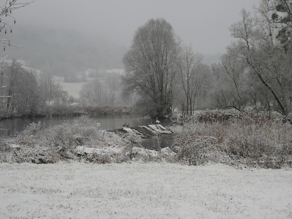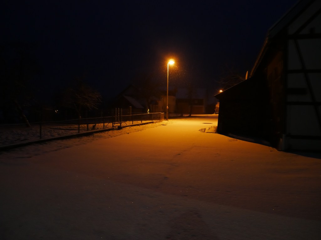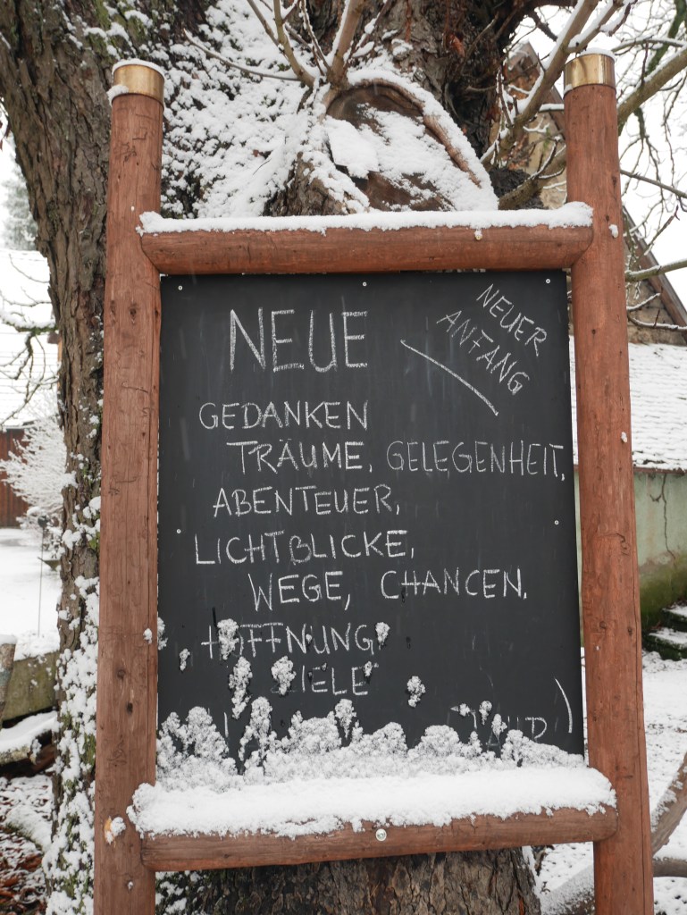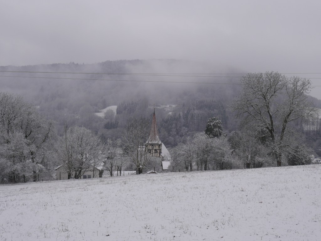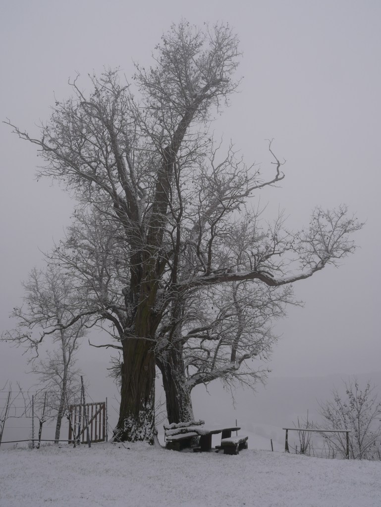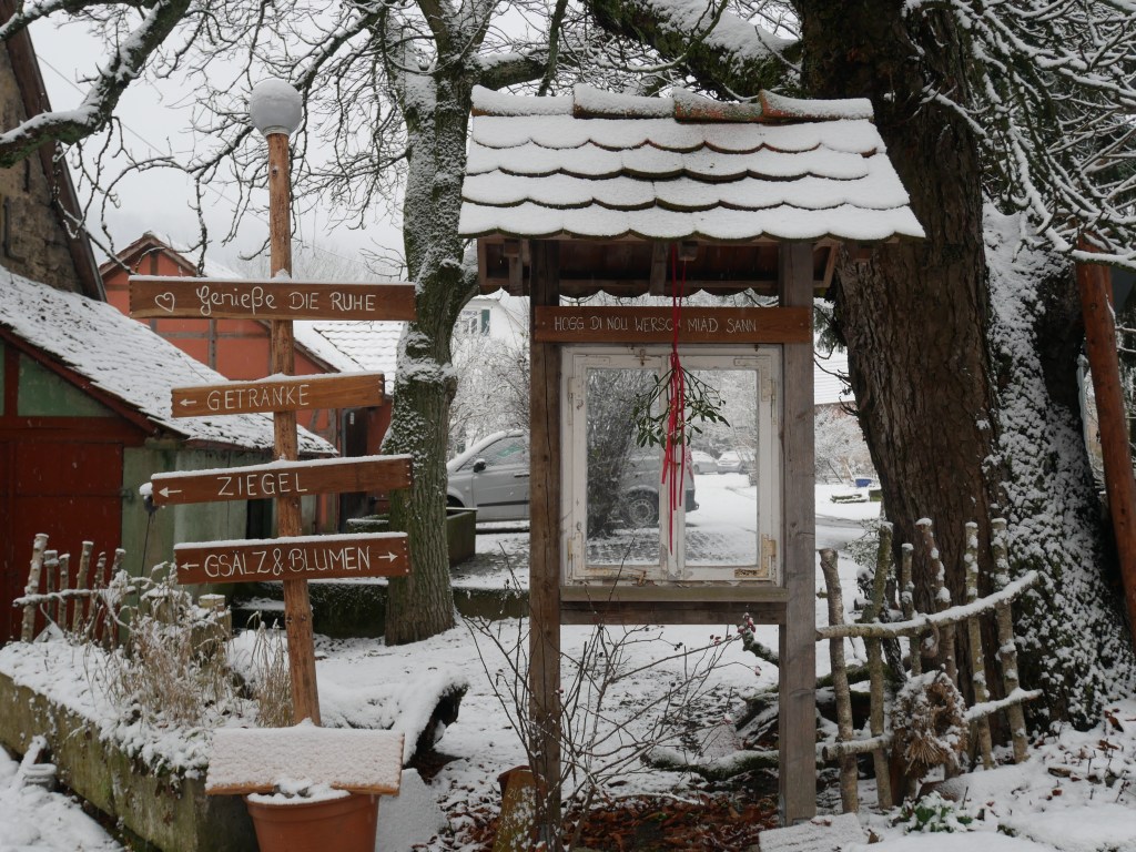 Als ich am Samstag auf den Wetterbericht schaute war klar, dass ich mich am Sonntag in der Früh zu einer Wanderung aufmache. Ich plante kurzerhand meine Tour und ging früh ins Bett. Um 6 Uhr klingelte der Wecker, was sich für einen Sonntagvormittag natürlich erst einmal doof anhört. Erstaunlicherweise kam ich sehr gut aus dem Bett und nach den zwei Tassen Kaffee und einem kleinen Frühstück, ging es um kurz nach 7 Uhr los. Als ich die Tür meine Wohnung verlassen hatte, war es noch dunkel und die Laternen beleuchteten die Straße. Es schneite und alles war bedeckt von einem dünnen weißen Teppich. Ich machte meine Stirnlampe an und lief los. Es ging auf in Richtung Jagsttal durch den Brüchlinger Wald. Auf dem Frankenweg „HW8“, welcher durch den Wald bis nach Langenburg ging, lief ich durch den verschneiten Wald. Die Ruhe in den Morgenstunden war wunderschön! Schon bald sah ich die ersten Rehe und Füchse über die Waldwege huschen. In meinen Gedanken war ich beim 18. September, als ich von Unterregenbach den Heimweg antrat. Man, mir kam das wie eine Ewigkeit vor in diesem Moment! Anstatt nach Langenburg abzubiegen, ging es vorbei an den „Römerwiesen“ hinab an die Jagst nach Oberregenbach. Die „Römerwiesen“ wurden so früher genannt, doch später wusste man, dass der Limes mehrere Kilometer östlich von hier war und die Bezeichnung somit nach dem heutigen Stand nicht mehr ganz korrekt ist. Ich überquerte die Brücke bei Oberregenbach wanderte hinauf zur Höhe, wo ich mich dann im Hohenlohekreis befand. Der Hermann-Lenz-Weg führt hier von Langenburg bis nach Schloss Stetten. Die Wege über verschneite Wiesen und durch kleine Waldstücke haben mir sehr gefallen. Immer wieder stehen auch kleine Geschichten zu den Orten entlang des Hermann-Lenz-Weges und so erfuhr ich, dass die „Hohe Landstraße“ zwischen Mäusdorf und Laßbach bereits in vorgeschichtlicher Zeit eine wichtige Fernverbindung von Basel über Heilbronn, Nürnberg, nach Leipzig war. Auch der „Gelbe Wagen“ der Thurn und Taxis-Post fuhr auf dieser Strecke und hielt in Laßbach an der früheren Poststation. Der Weg zum Schloss Stetten ging durch den Waldfriedhof und über einen schmalen Pfad. In Schloss Stetten waren mehrere selbstgestaltete Grippen zu besichtigen. Das Schloss selber lag im Nebel ein wenig versteckt und somit ging es nach einer kurzen Vesperpause hinab nach Kocherstetten. Am Erlesbach entlang ging es durch dieses schöne Örtchen. Besonders an diesem Ort sind die schönen Fachwerkhäuser und die alte Kirche aus dem Jahre 1366 mit dem alten Fachwerkkirchturm. Entlang des Kochers ging es dann bis nach Steinbach, denn es sollte über den Tierberg wieder zurück nach Langenburg gehen. Der Blick vom Kocher auf Schloss Stetten und die Burg Tierberg war toll, denn beide lagen so ruhig und verwunschen im Nebel. Der Anstieg zum Tierberg hatte es ein wenig in sich. Erst ging es entlang der Höhe, mit dem Blick auf das Kochertal, vorbei am Dorf Weilersbach und von dort in den Wald hinein. Spontan entschied ich mich nicht über die Dörfer Winterberg und Sommerberg zur Burg hinauf zu gehen. Ich wollte durch den Wald weiter schlendern und so ging es durch den Wald auf dem Tierberg entlang und auch durch den Wald wieder runter nach Bächlingen. Dort angekommen, machte ich eine längere Pause und ruhte mich ein wenig aus, da ich nun schon fast 30 km gewandert bin ohne einen längeren Stopp. In Bächlingen führt eine alte Holzbrücke über die Jagst. Ich setzte mich in eine der Nieschen und trank meinen Tee und machte meine Mittagsrast.
