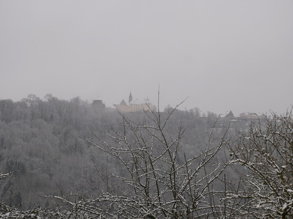 Frisch gestärkt ging es nun über die „Alte Steige“ hoch nach Langenburg zum Schloss. In normalen Zeiten hätte es hier von Touristen gewimmelt, aber aktuell ist es ja nicht möglich und so war es sehr ruhig. Nur ein paar Kinder sah ich eine kleine Schneeballschlacht machen. Auf dem Rückweg ging es wieder durch den Brüchlinger Wald nach Billingsbach. Die große Winterwanderung habe ich sehr genossen. Die frische Winterluft, die Ruhe im Wald, wenn du nur die Vögel hörst und das Geräusch im Schnee, wenn du deine Schritte machst. Es gab einen kleinen Abschnitt im Wald, wo du durch einen dichten Tannenwald läufst. Der schmale verschneite Pfad und die verschneiten Tannen waren echt toll und auch wenn der Himmel durchgehen grau war, war es dennoch ein wundervoller Tag! Zu Hause freute ich mich dann auf eine Tasse Kaffee und legte die Beine hoch! Auch ich habe in den letzten Jahren viel zu wenig die Region erkundet. Natürlich den Brüchlinger Wald kenne ich, aber ich war zum ersten Mal in Schloss Stetten und auf dem Tierberg. Es war toll und ich weiß jetzt schon, dass noch einige Touren folgen werden im Schnee, denn er soll noch ein wenig liegen bleiben! 🙂