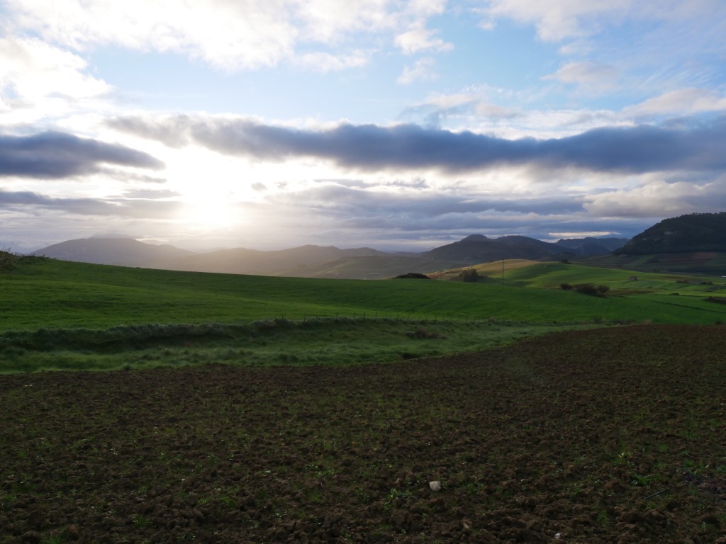 Frisch gestärkt ging es weiter durch das hügelige Hinterland. Es ging vorbei an Weidewiesen und Weinbergen. Der Schulbus kam mir entgegen und ich streifte kleine Dörfer. Die Sonne kam heraus beleuchtete diese Landschaft wunderschön. Die kleinen steinernen Schuppen zwischen den Hügeln komplettierten dieses Landschaftsbild. Als ich an einen alten Bahnhof und die Autobahn kam, war es leider für ein paar Stunden nicht mehr so schön, denn an der Straße lag leider sehr viel Müll. Hier machte sich das Problem der Müllmafia bemerkbar, von der ich schon einiges gelesen habe. Von Fernseher, Kühlschränke bis Reifen lag hier alles am Straßenrand. Es wurde ein anstrengender Weg nach Alcamo, denn der Wind wurde wieder stärker und es fing an zu regnen. Der Regen peitsche mir ins Gesicht und ich bekam Hunger. Ich schleppte mich förmlich die Anhöhe nach Alcamo hoch. Ich war platt. Ich war hungrig und müde nach dieser kurzen Nacht… Der Regen hörte nicht auf und prasselte auf mich ein. Als ich auf die Hauptstraße kam, gab mir der starke Verkehr und der damit verbundene Krach den Rest. Ich schleppte mich in den nächsten Hauseingang und setzte meinen Rucksack ab. Bei einem Bäcker holte ich mir neben an ein “Cornetto” (Hörnchen). Mein Rucksack fühlte sich die letzen Kilometer so schwer an. Ich war jetzt den 4. Tag unterwegs und im ersten Loch… Ich fühlte mein Wasserhaushalt auf und versuchte mich zu sammeln. Es ist einer dieser Moment, wo du das alles hier verfluchst. Gestern noch ein wundervoller Tag im Nationalpark und heute!? Mein Handy zeigte kein Café in der Nähe an. Ja, willkommen auf Sizilien. Mit Google Maps kommst du hier nicht weit, was in solchen Momenten natürlich zusätzlich auf die Stimmung drückt. Ich schickte ein kurzes Stoßgebet hoch in den Himmel, dass ich einfach ein Ort finde, wo ich mich reinsetzen kann und meine Sachen trocknen kann. Nach ein paar Meter fragte ich einen Marktverkäufer, ob es ein Café gibt und tatsächlich war es nur ein paar Meter weiter. Es war der Himmel auf Erden – mein persönliches „Café am Rande der Welt“. Ich trat mit meinen nassen Klamotten in das Café und wurde von einem tollen Kaffeeduft und zwei jungen Frauen mit einem freundlichen „Buongiorno“ empfangen. Es war ein kleines Café mit einer langen Theke, wo so einige kleine Leckereien zwischen den Broten und den „Tramezzini“ (die Italienische Art eines Sandwich) lagen. Mein Magen knurrte… Ich bestellte einen Früchtetee, einen Espresso und zwei Tramezzini mit Tomaten, Mozzarella und Schinken! Es gab 2 kleinere Tische an dem jeweils schon zwei Gäste saßen. Ich fragte einen älteren Mann in meinem einfachen italienisch „Scusa, Questo posto è libre?“ und mit einem freundlichen „Sí, prego!“ setze ich mich hin, nachdem ich meine nasse Jacke aufgehängt hatte.